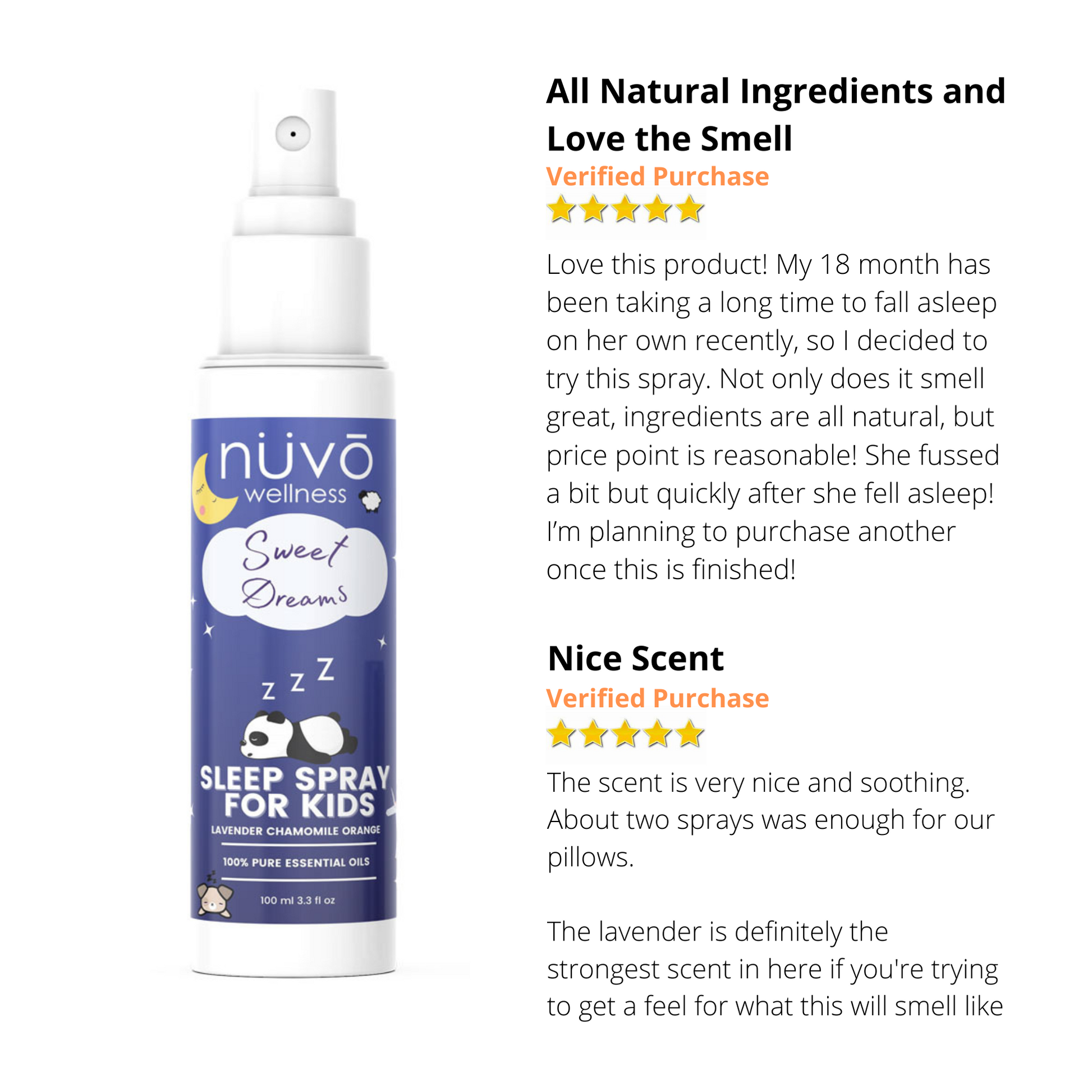 The subtle hint of orange essential oil adds a delightful, citrusy twist to the bedtime routine, making it an instant hit with your little dreamers. At Nuvo Wellness, we're committed to your family's well-being. Rest easy knowing our Kids Pillow Sleep Spray is composed of pure essential oils – no synthetic fragrances or harmful additives. Our devotion to your satisfaction is unwavering; we offer a risk-free purchase with a 100% satisfaction guarantee. Sweet dreams are just a spray away.