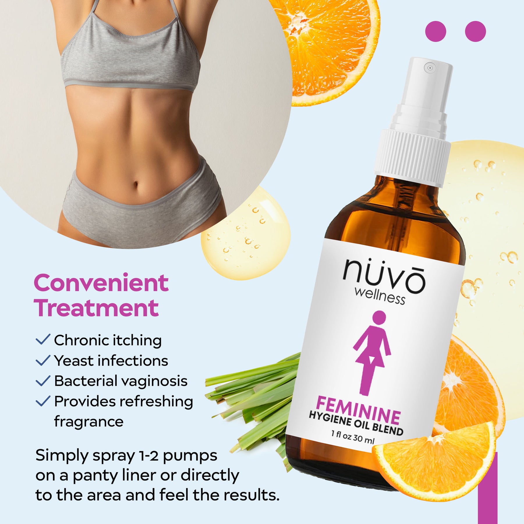 Ready for ultimate comfort and freshness? Spray Nuvo Wellness Best Feminine Hygiene Oil for all-day relief. Say goodbye to itching, burning, and odor.