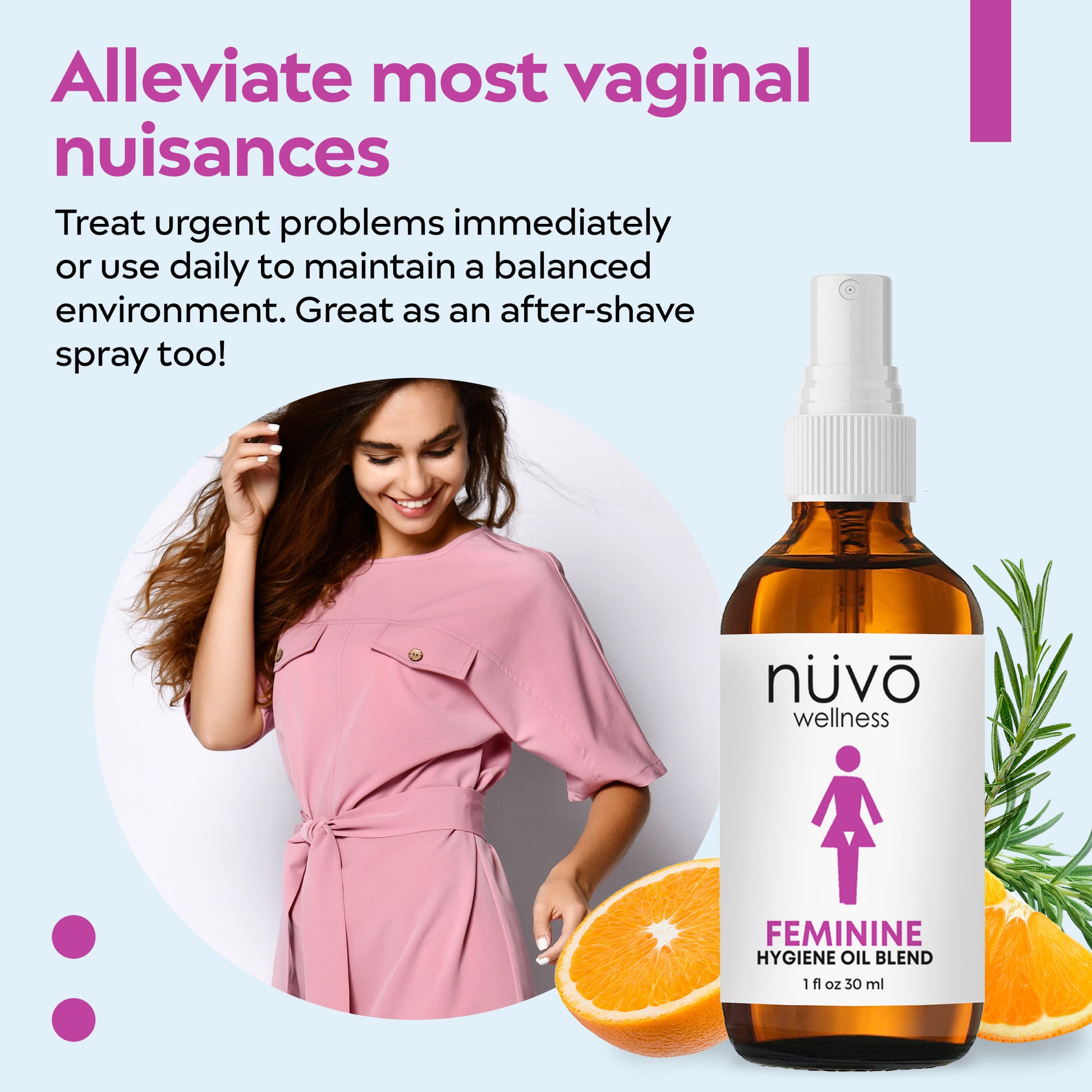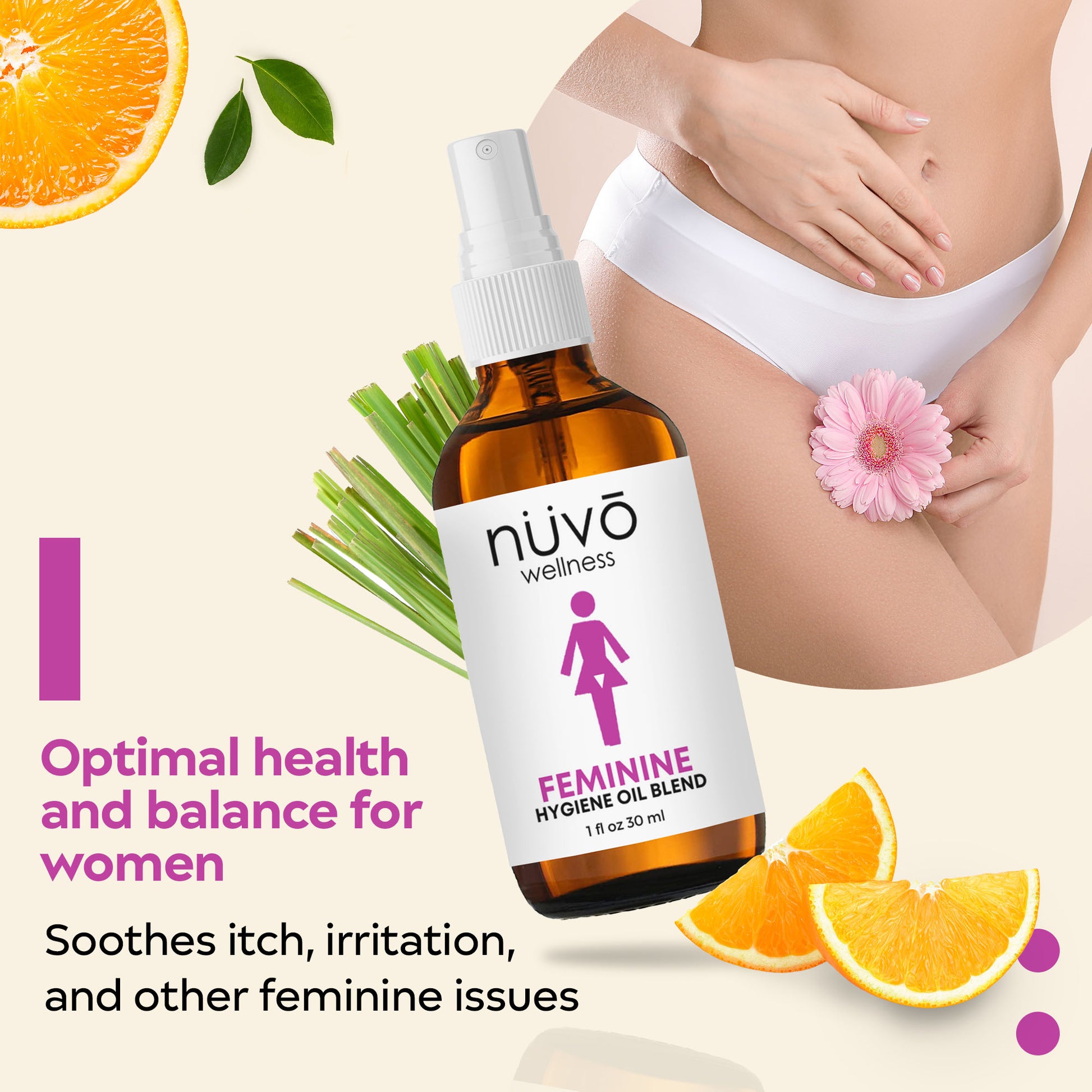 Ready for ultimate comfort and freshness? Spray Nuvo Wellness Best Feminine Hygiene Oil for all-day relief. Say goodbye to itching, burning, and odor.